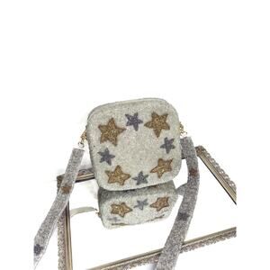 White Box Bag Purse with Stars / Gold Silver / Beaded / Zipper Closure / Handmade Seed Beads / Unique Gifts for Her / Crossbody Long Strap