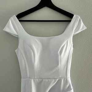 This dress has a sheath silhouette with no embellishments. It is made entirely of a bright white stretchy material that hugs your curves nicely and then gently flares out at the upper thigh. It has cap sleeves and an elegant square neckline. There is some subtle ruching/gathering of fabric on one side of the dress on the hip area. It's comfortable to sit down in and does not have a train. The back has a concealed white zipper and the dress is fully lined. There are also lightly padded built-in bra cups, so an additional bra is not required. This dress rust reaches the floor if the total height of the person wearing it is 5'-10". Overall, the look of the dress is sophisticated, timeless, and elegant. This dress was custom-made for me, hence why there are no tags or labels sewn into the dress. It has been recently dry cleaned.