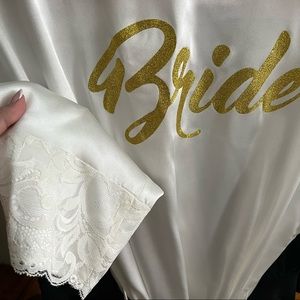Bridal robe. Gift from bridal party. Only wore to take picture getting make up done. In perfect condition. No rips, stains, snags. Added lace to sleeves to elevate the overall look.