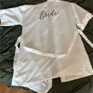 Elegant white robe with 'Bride' text. Perfect for weddings. Worn once