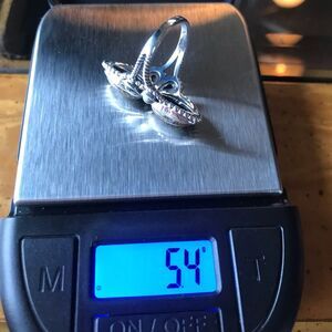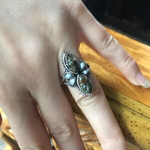 This statement ring is made with all genuine, earth mined stones. The black and white stones are white Buffalo, also known to some as white turquoise. This stone is a popular stone in Native American jewelry. The blue turquoise used in this ring is a new find from the Royston mines and has been named blue horizon turquoise. It has a heavy matrix pattern and is a stunning stone. The metal on this ring is solid .925 sterling silver. This is a very unique, quality piece that should last for years. The ring in the photos is the one you will receive, so please see photos for gemstone quality and measurements. Size 6.