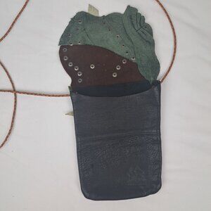White Buffalo Creations Handmade Leather Crossbody. Crossbody bag with a long strap, inside is one compartment. Flap is made of leather in different abstract shapes and colors with silver tone stud detail. Logo embossed on the front. Handcrafted one of a kind leather bag with a boho natural vibe. Interior is unlined animal hide. Bag has an asymmetrical shape to it. Western, Native, hippy, gypsy, festival, Coachella, earthy, artsy, rodeo. Preowned- nice condition. Mark on the front- not sure if it due to wear or due to the natural material; some factory white marks on the inside of the flap which is concealed by the interior edge; one tiny one on the back. Please see pictures for approximate measurements.