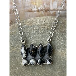 This stunning necklace features dramatic Black Stallion White Buffalo Turquoise cabochons in a bold dahlia-style arrangement. The striking contrast of black, white, and golden-brown matrix makes each stone unique. Set in sterling silver with fine sawtooth bezels, this piece has an adjustable chain that can be worn at various lengths up to 18 inches. Perfect as a statement piece for layering or wearing solo.