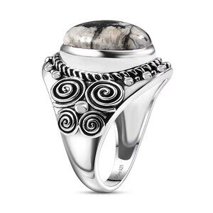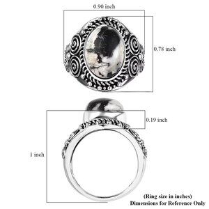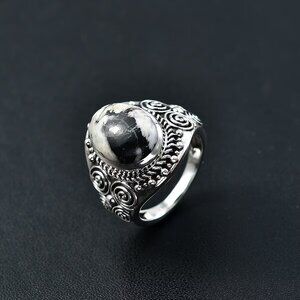 This genuine White Buffalo Turquoise ring features a stunning oval cabochon set in ornate sterling silver scrollwork. The stone displays the characteristic black and white matrix pattern unique to White Buffalo—each piece is one of a kind.