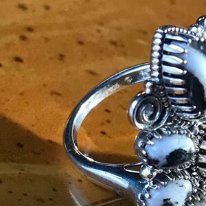 This beautiful statement ring is made with genuine, earth mined white buffalo (also known to some as white turquoise). The ring is set in solid .925 sterling silver and has an antique look to it. Each white buffalo ring is one of a kind due to the variations in this stone. The ring in the photos is the one you will receive :) Size 7. Brand new (worn for photos only).