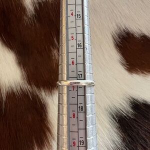 The face of the ring measurements as seen in the photos are .38”L x .22”D. The band measures 2.4mm. The ring measures size 6.75 and it weighs 2 Gm. It is a partially open back style. It is hallmarked “925” on the inside band.