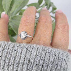 Sterling White Buffalo Turquoise Ring. Southwestern 925 sterling silver ring with a pretty white buffalo turquoise oval stone. Native design, dainty with a face height of 9mm. Nice roping around the bezel, and two Native raindrops on the sides. Various sizes in the dropdown. Stamped 925.