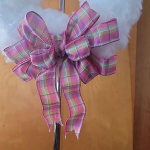Charming white wreath with bunny ears. Features a pink plaid bow for a playful touch.