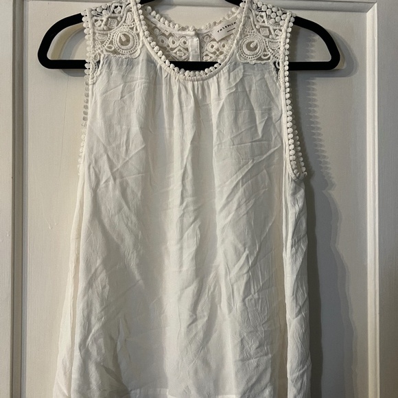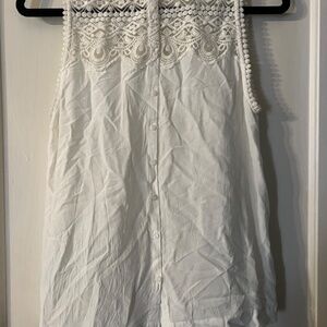 Women’s tank with button detail down the back, lace detail on shoulders.