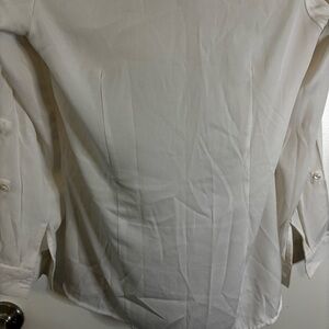 Lightweight white button down blouse with a large bow or you can leave it down untied. Collared blouse. Long sleeves with button cuffs.