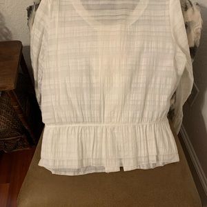 This white on white blouse buttons down the front, giving way to a flattering ruffle. The ruffle forms the hem. Similar ruffles make up the 3 1/2” arm cuff/hem.
