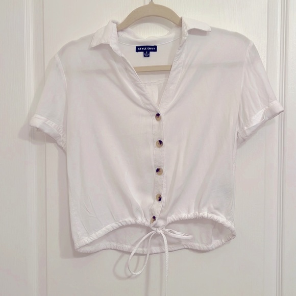 White Short Sleeve Top - with buttons and adjustable bottom (strings to make tighter)