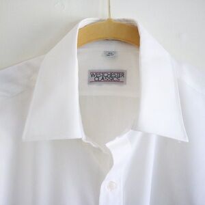Classic white button up dress shirt. The fabric is lightweight and slightly transparent. This is also single needle tailoring.
