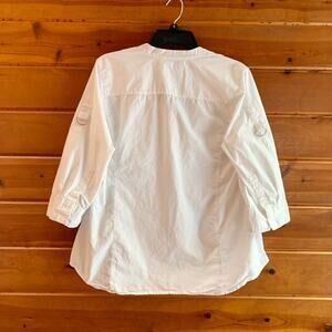 Fashion Bug white button up with roll up sleeves with toggles, buttons at sleeve hems to wear unrolled, embroidery at v neck, classic fit, gently worn overall good condition, dress it up or down