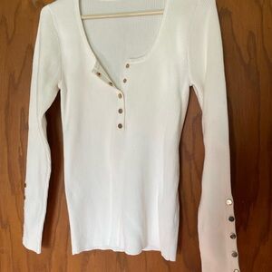 Elevate your wardrobe with this chic white ribbed top. Featuring stylish button details on the sleeves, it's perfect for any occasion.