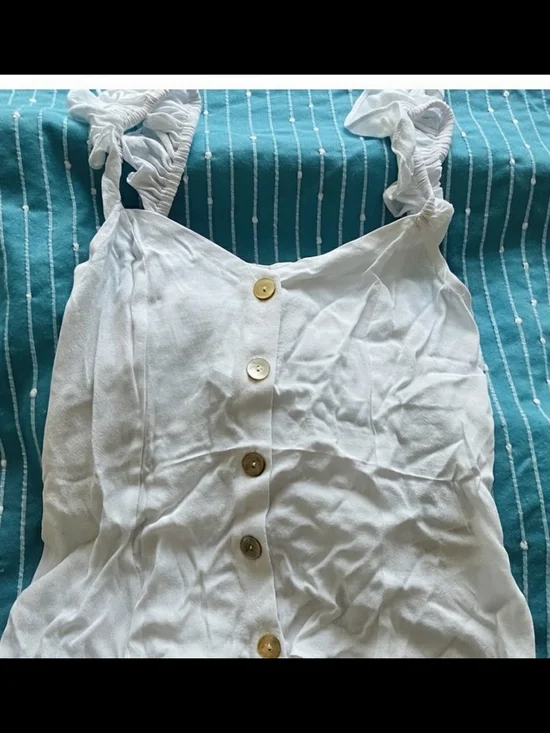 Lightweight white tank top with front button closure. Features ruched ruffle shoulder straps. Soft, breezy fabric ideal for warm days. Versatile and easy to style.