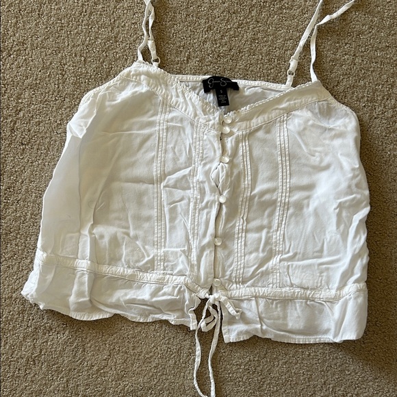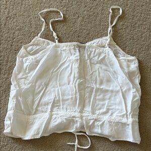 Lightweight white cami with thin adjustable straps. Front button placket with fabric-covered buttons. Drawstring tie at the waist for a cinched look. Subtle pintuck details for texture. Breezy and versatile for layering or warm days.