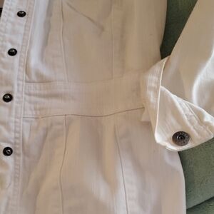 Stylish white denim button-up jacket with silver snaps. Perfect for casual wear. Medium weight denim-like jacket with 2 tiny front pockets with snap closure. Defined waistband, with jacket length to hips. Snap closure at wrists. Solid back. Like new.