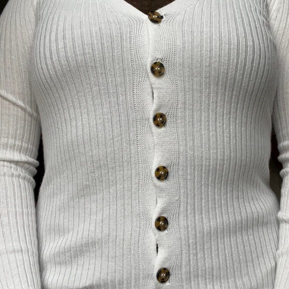 Stay cozy and stylish with this white ribbed sweater. Featuring a classic button-up design, it's perfect for any occasion.