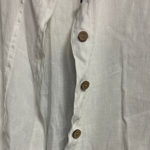 Stylish white button-up shirt with short sleeves. Perfect for casual wear. No Brand. Made in Italy. 100% linen. No size, but looks L