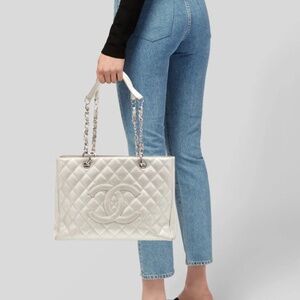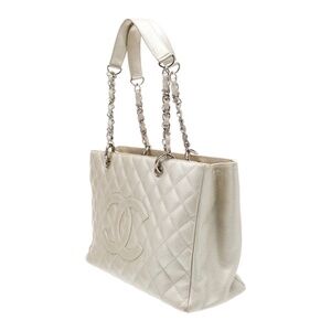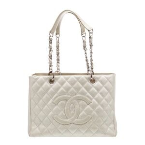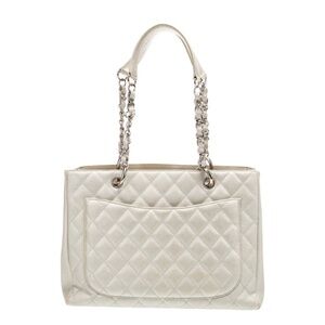 Stunning White Chanel Grand Shopping Tote in Caviar Leather. It is quilted and has chain link accents. The hardware is silver toned. There is a single exterior pocket and is lined in grosgrain. There are three interior pockets. This vintage bag is from Karl Lagerfeld from 2008-2009.