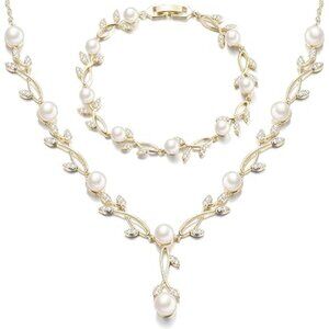 Plants have provided our designers a great deal to emulate in the way of shapes, textures, and colors of our jewelry. It features sparkly CZs which will make a timeless accessory to any jewelry collection. All simulated shell pearl is the finest pearl, hand picked for its luster, quality, color, and cleanliness strictly and meticulously. This wedding jewelry set can be worn with classy casual or formal attire.