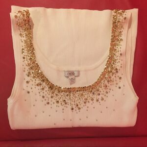 White Cache top with gold sequence. Stretchy material. New, never been used.XS size is available