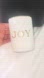 Elegant white candle with gold accents. Features the word 'JOY'. Perfect for home decor. Smells delicious, vanilla.