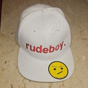 Stylish white cap featuring a bold red embroidered 'rudeboy.' logo. Perfect for casual wear | Excellent pre-loved condition