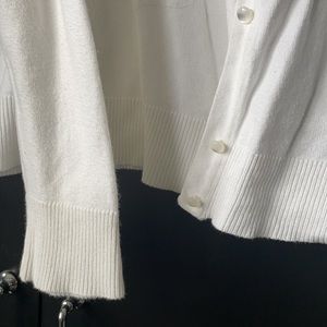 white cardigan with pearl button details. full length sleeve. hem falls right above waist
