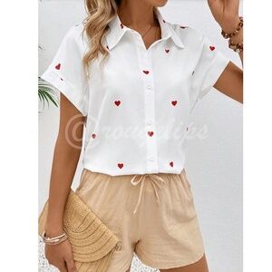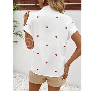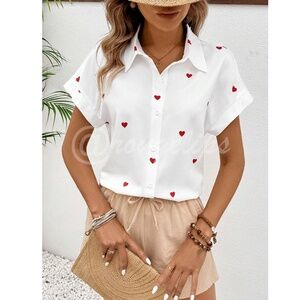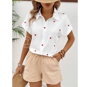 White Casual Shirt Printed Red Hearts Button Down Up Short Sleeve