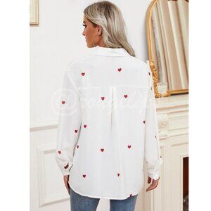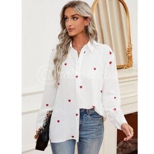 White Casual Shirt Red Hearts Printed Button Down Up Long Sleeve