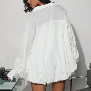 White Casual Women's Balloon Bubble Hem High Low Deep V Collar Shirt
