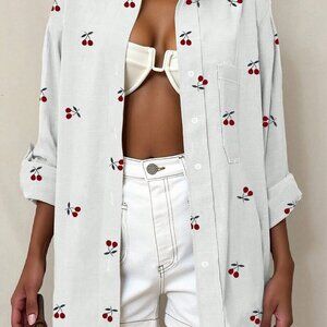 White Casual Women's Cherry Print Vacation button down Shirt