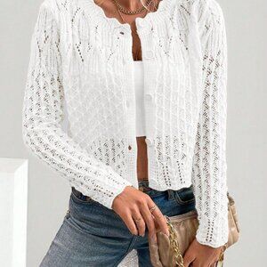 White Casual Women's Crew Neck Hollow Front Button Cardigan Knit Sweater
