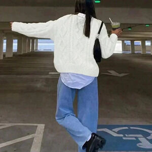 White Casual Women's Deep Round Neck Cable Knit Loose Pullover Sweater