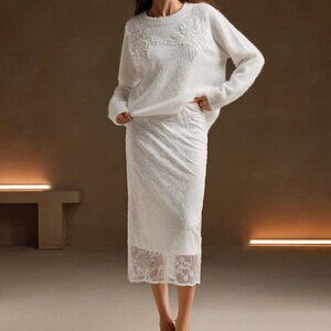 White Casual Women's Elegant Sequin Floral Round Neck Loose Sweater