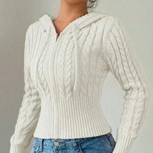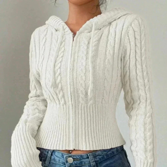 White Casual Women's Fitted Drawstring Hooded Cardigan