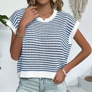 White Casual Women's Knit Mix Striped Round Neck Loose Knit Top