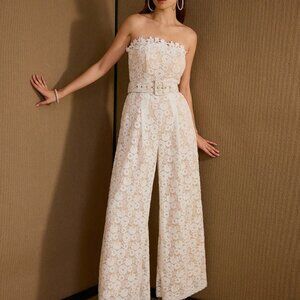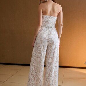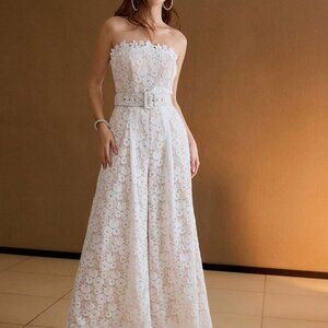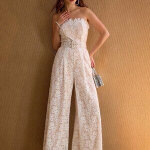 White strapless jumpsuit with a sleek buckle belt, crafted from delicate lace and featuring elegant fold‑pleated detailing. The regular‑fit silhouette falls to a long length, while the wide‑leg cut adds fluid movement. Sleeveless and strapless, it offers a clean, modern look perfect for dressy occasions or sophisticated daytime events. The combination of lace texture, pleats, and a statement belt creates a refined, fashion‑forward ensemble.