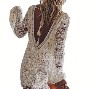 White Casual Women's Long Lantern Sleeve Hollowed Lace Flower Deep V Mini Dress