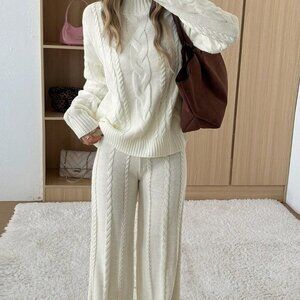White Casual Women's Round Neck Long Sleeve Top And Pants Suit