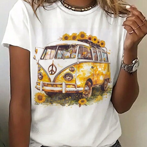White Casual Women's Round Neck Short Sleeve Floral & Bus Print Loose T-Shirt