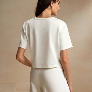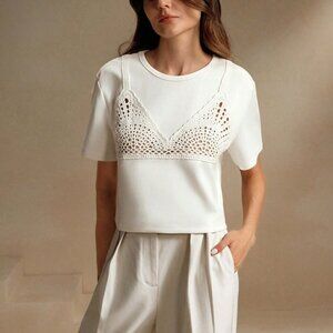 White Casual Women's Round Neck Short Sleeve Lace Patchwork Loose Crop Top