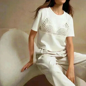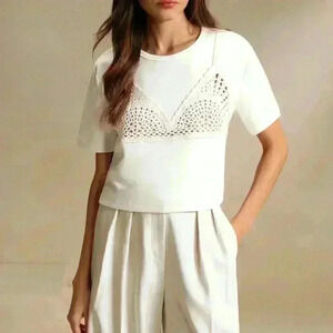 White Casual Women's Round Neck Short Sleeve Lace Patchwork Loose Crop Top