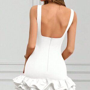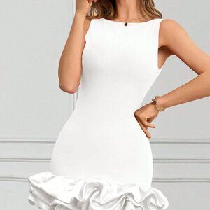 White Casual Women's Round Neck Sleeveless Ruffle Hem Elegant Short Dress