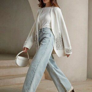 White Casual Women's Sequin & Faux Pearl Embellished Sweater Cardigan