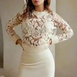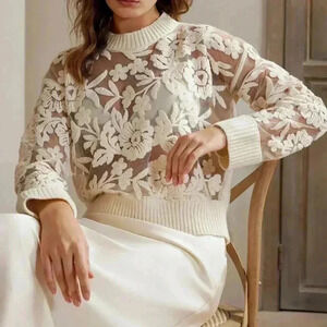 White Casual Women's Sexy Flower Jacquard Sheer Mesh Panel Sweater