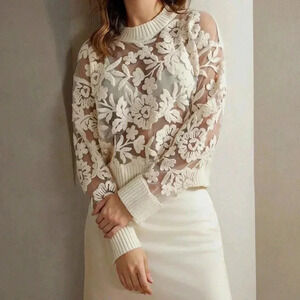 White Casual Women's Sexy Flower Jacquard Sheer Mesh Panel Sweater