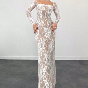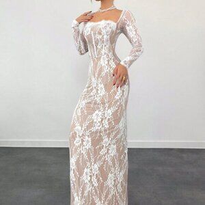 White Casual Women's Sexy S-Shape Lace Long Sleeve Cupped Bustier Tight Fitting